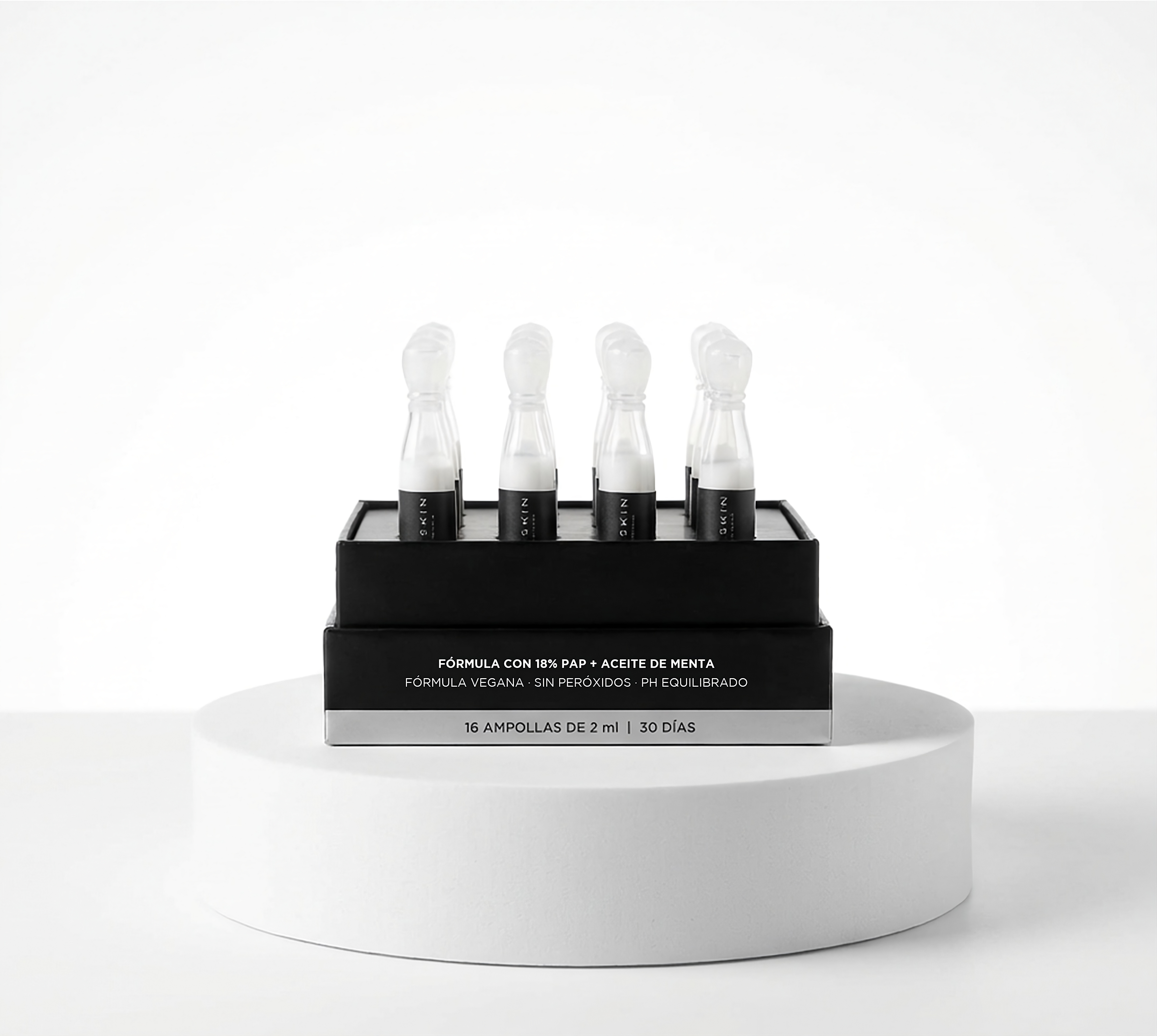 El PAP (ácido ftalimidoperoxicaproico) representa una nueva generación en tecnología blanqueadora. Frente a los geles con peróxido presentes en muchos productos cosméticos de uso en casa, pero limitados por normativa a concentraciones muy bajas (0,1%), el PAP permite una acción más eficaz, estable y segura. Su uso en concentraciones elevadas (hasta un 20%) aporta resultados visibles en menos tiempo y sin dañar el esmalte dental.