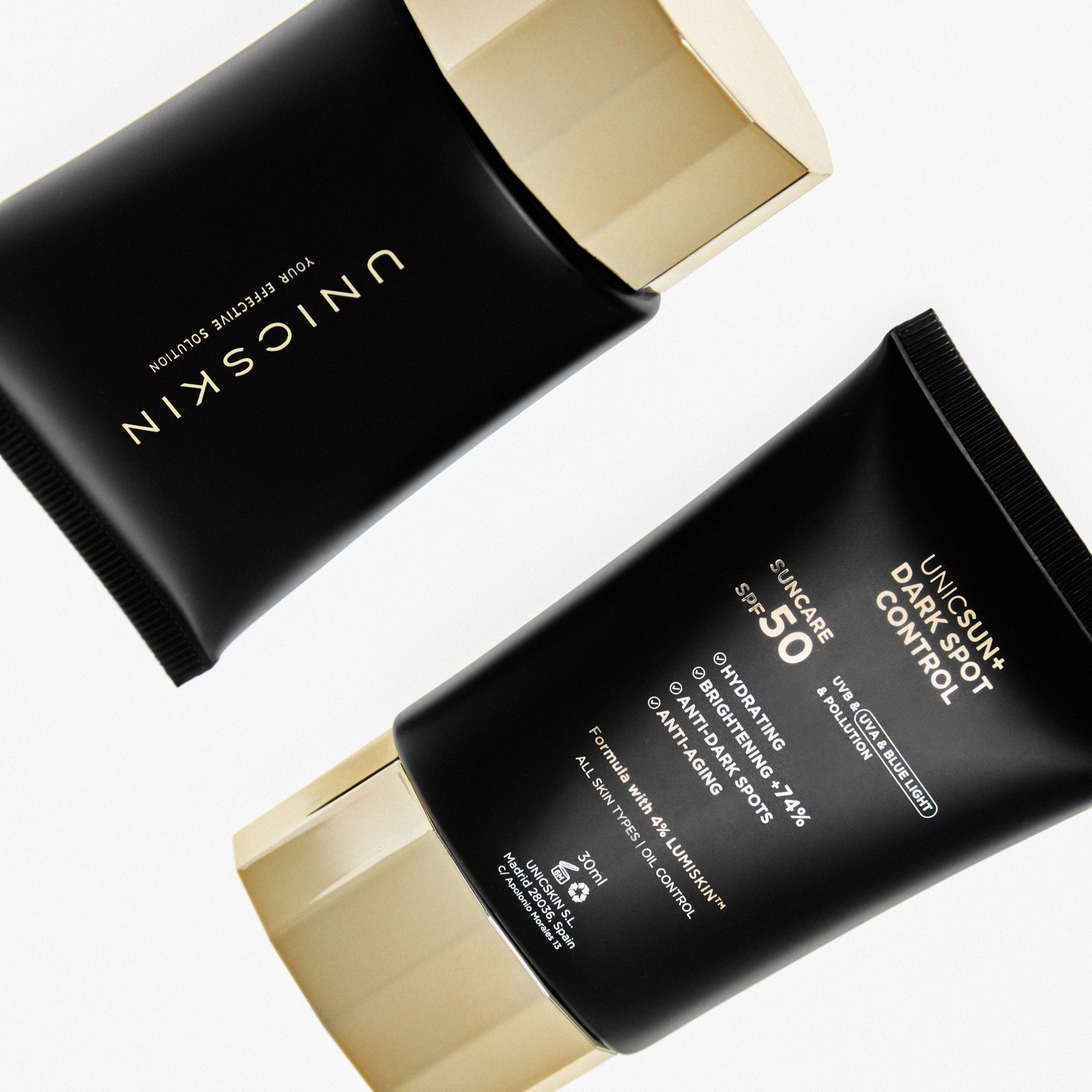 UNICSUN+ DARK SPOT CONTROL es un avanzado tratamiento facial urbano que combina protección solar SPF50 con una potente acción antimanchas y antiedad.
